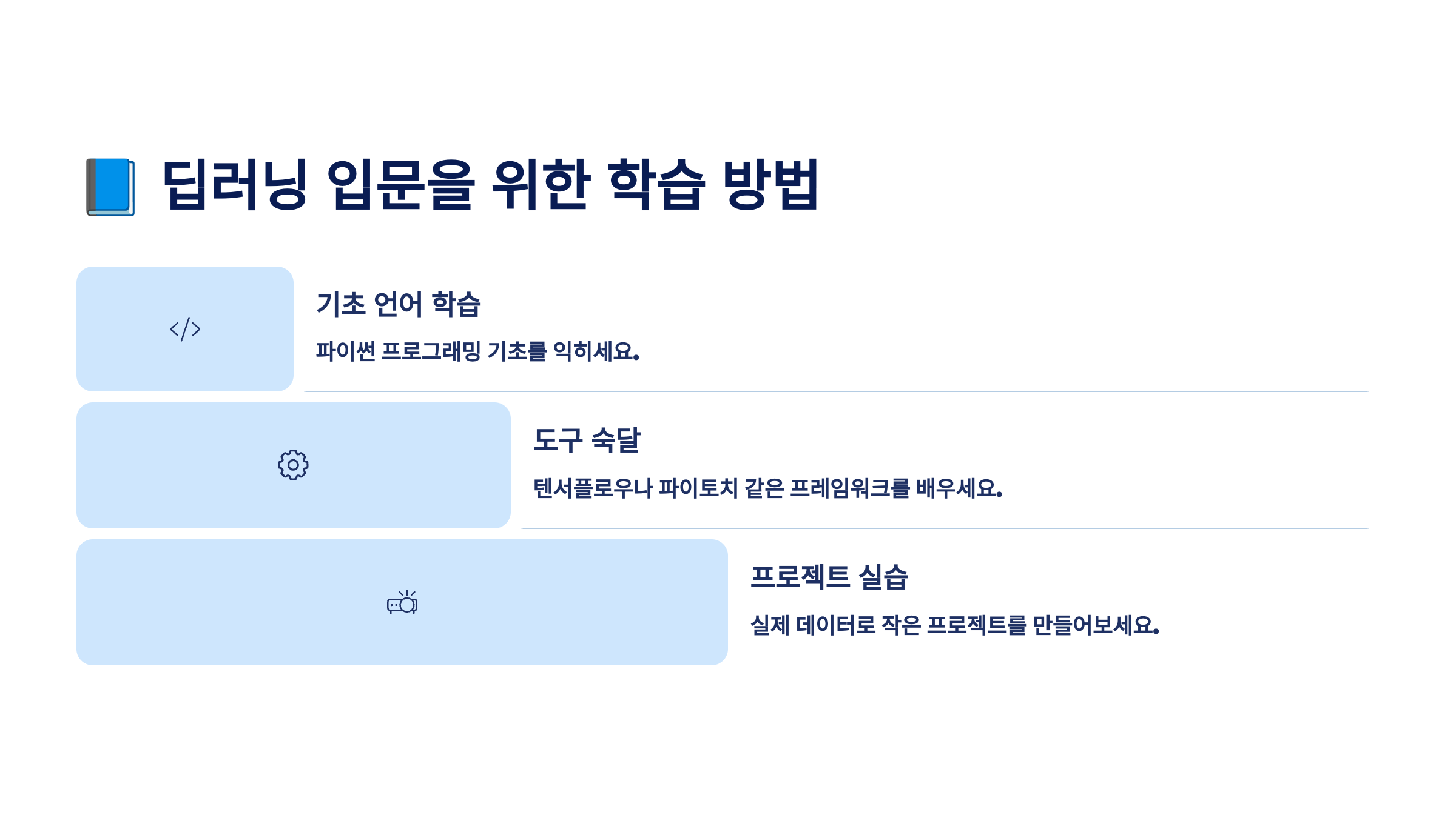 내가 생각했을 때, 딥러닝 학습의 핵심은 '무작정 암기보다 작은 프로젝트로 실습하면서 익히는 것'이에요. 학습 순서만 잘 따라가면 나도 AI 모델을 직접 만들 수 있어요! 🚀