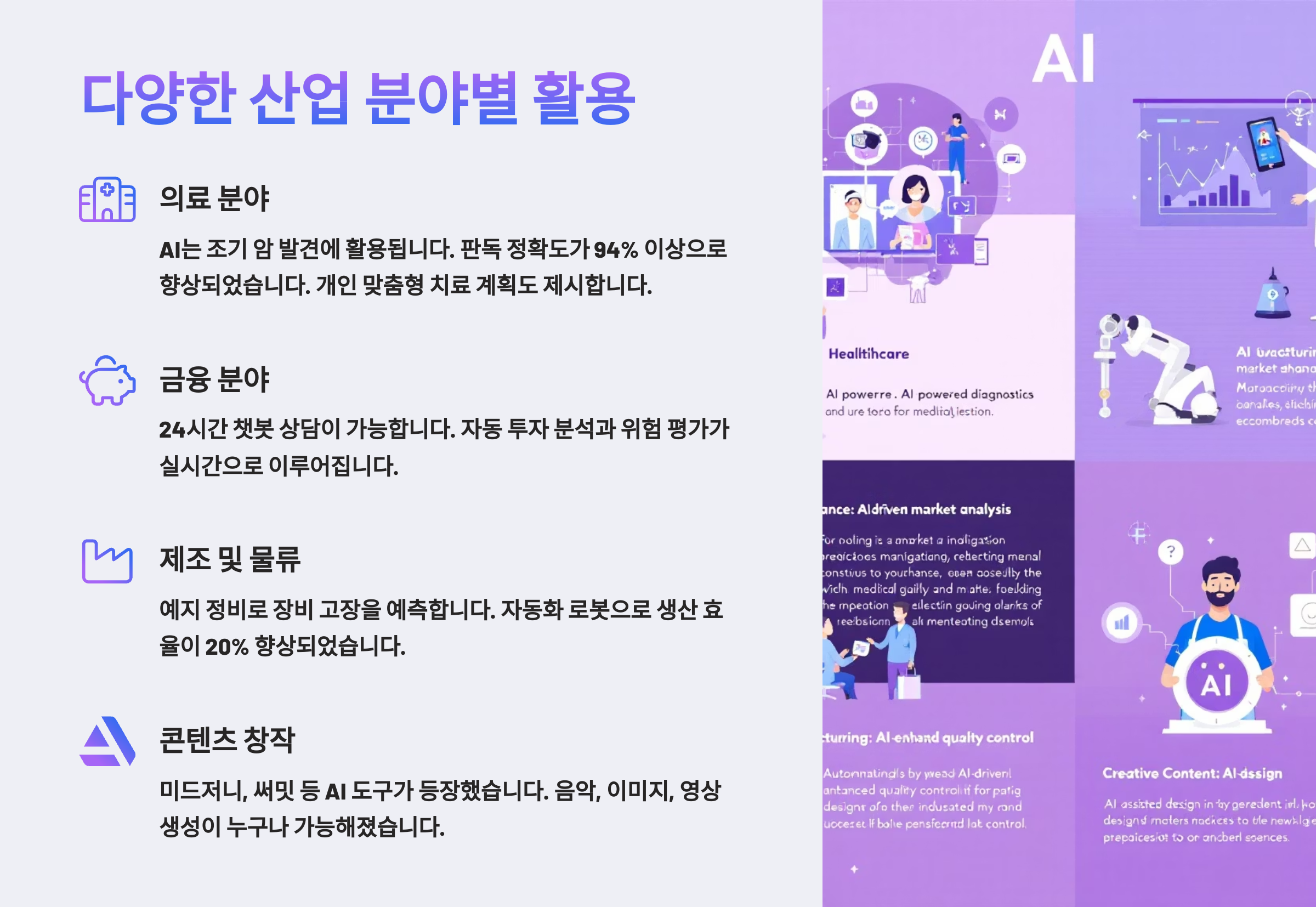 인공지능은 이제 특정 분야에만 머무르지 않고, 모든 산업을 혁신하고 있어요. 2025년 현재, 주요 산업별로 어떻게 활용되고 있는지 살펴볼게요. 🏭