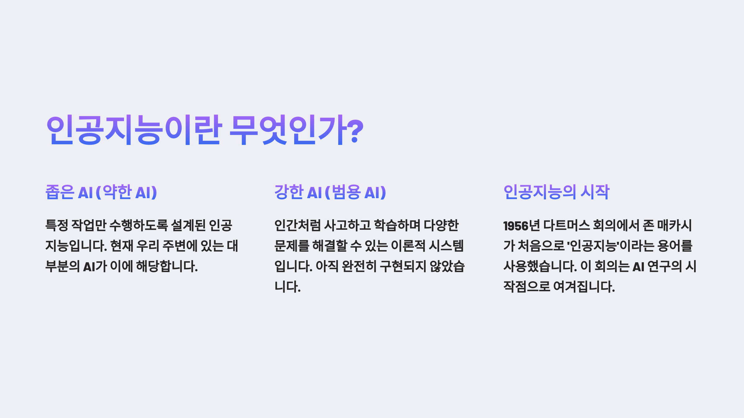 인공지능은 크게 협의적 AI(좁은 인공지능)광의적 AI(강한 인공지능)으로 나눌 수 있어요. 협의적 AI는 특정 분야에 특화된 기능(예: 얼굴 인식, 추천 시스템)을 수행하는 것이고, 광의적 AI는 인간과 거의 동등한 지능을 갖춘 시스템을 뜻해요. (현재는 대부분 협의적 AI 수준이에요!)