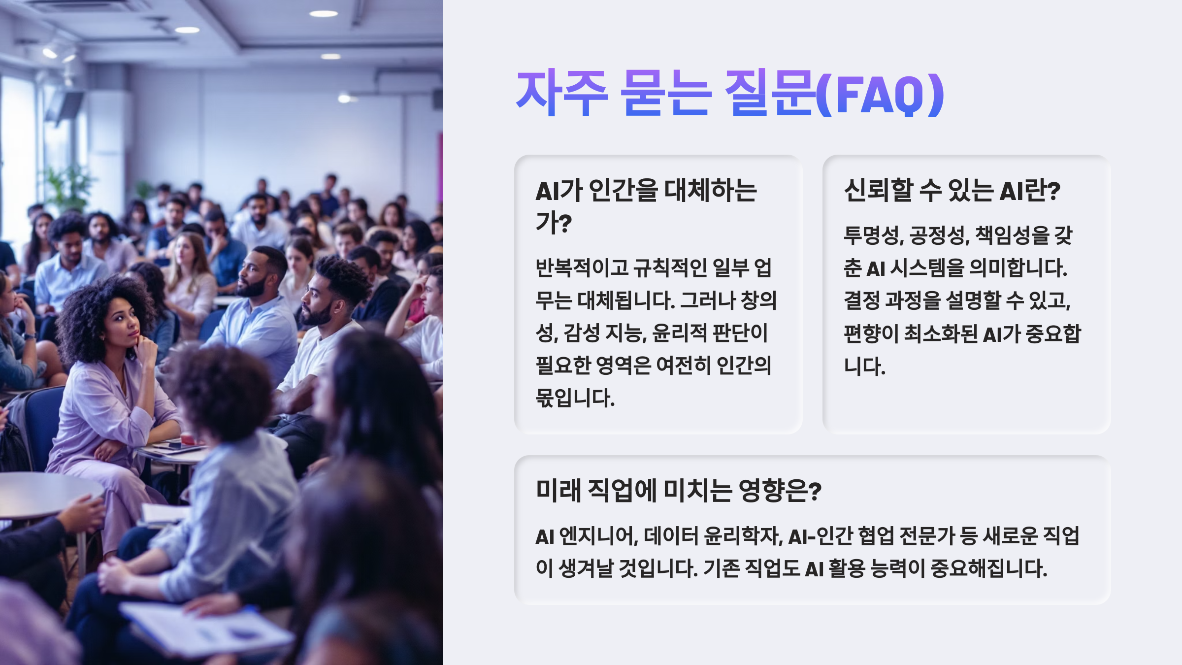 이제 인공지능의 한계와 윤리적 문제까지 살펴봤으니, 다음은 여덟 번째 섹션 ❓ FAQ로 넘어가서 사람들이 자주 묻는 질문들을 정리해줄게!