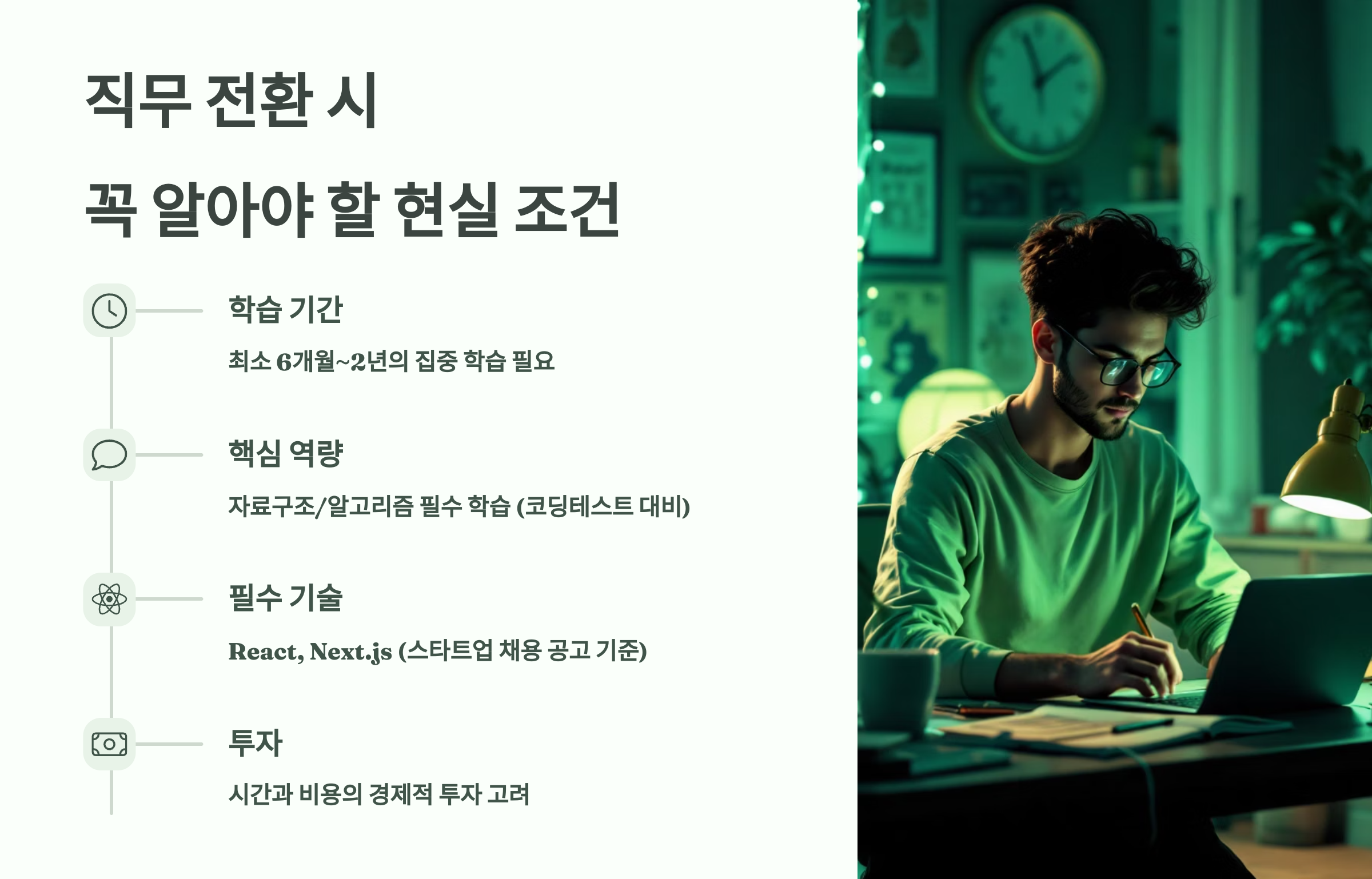 “코딩 배우면 바로 취업되겠지!”라는 기대감은 금물이에요. 비전공자가 개발자로 직무 전환할 때는 꼭 알아야 할 현실적 조건들이 있어요. 이걸 알고 준비해야 더 빠르게, 더 안정적으로 전환할 수 있어요. 😌📋