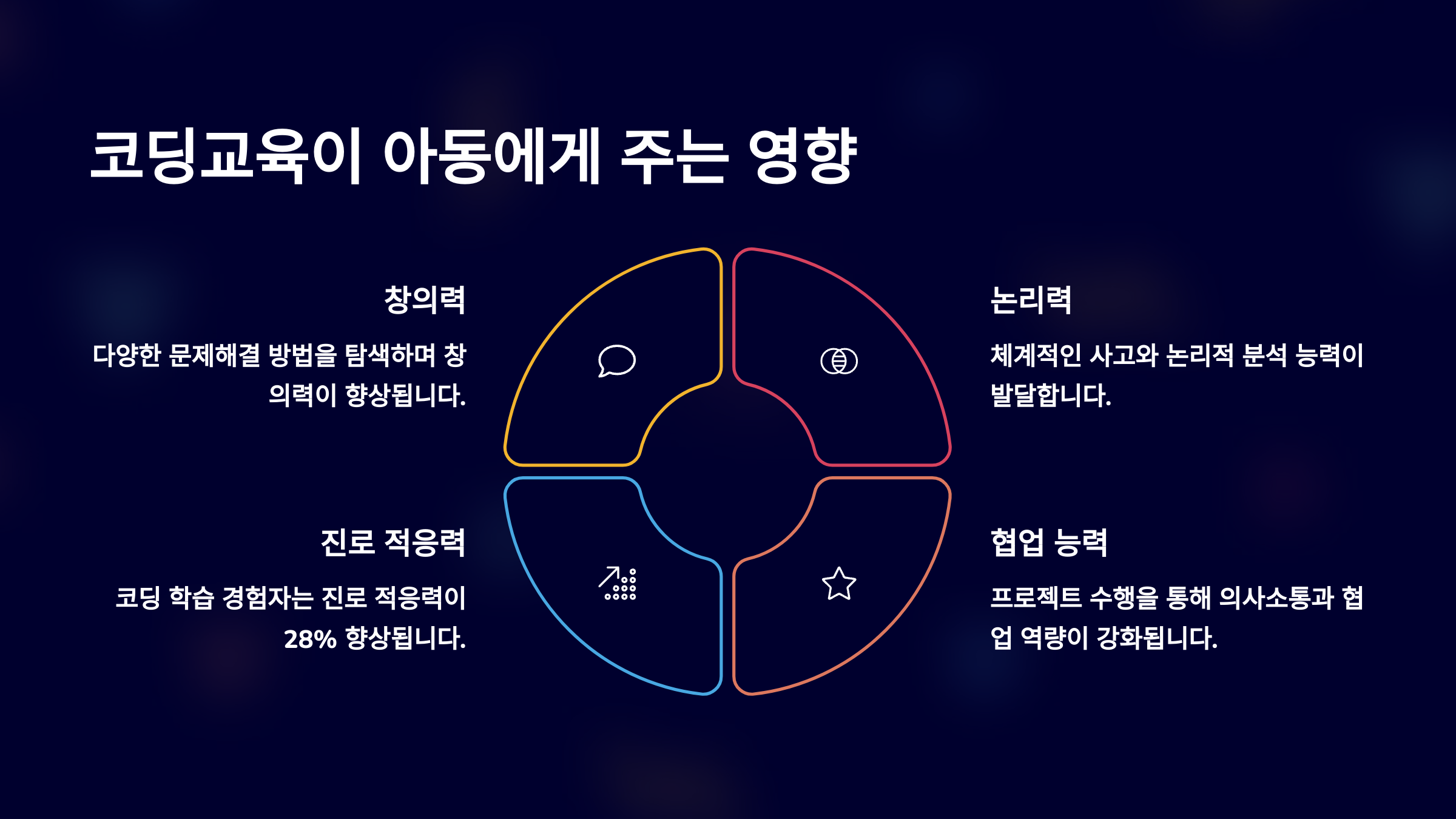 이제 다음으로 넘어가볼게요! 📊 코딩교육이 아이에게 주는 영향 단순 기술 이상의 의미를 갖는 코딩교육 효과를 정리해드릴게요!