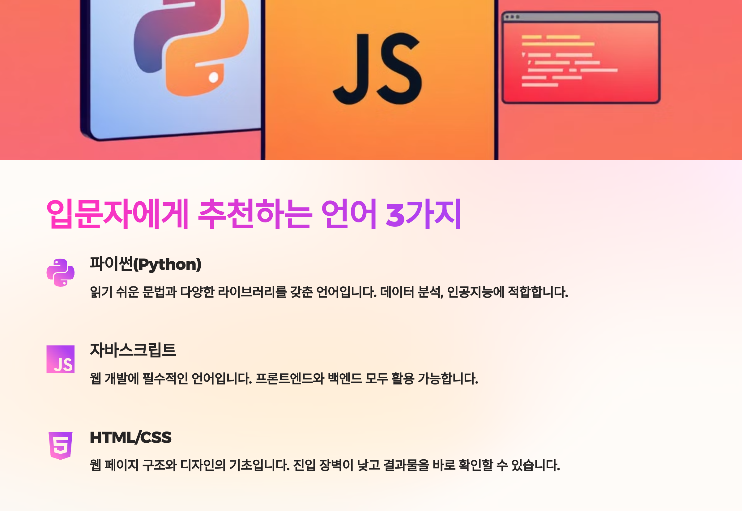 🎯 결론은? “쉽고, 재미있고, 결과가 보이는 언어부터!” 배움의 동기를 살리기 위해선 성공 경험이 중요해요. 내 관심 분야에 따라 하나를 선택해 도전해보세요!