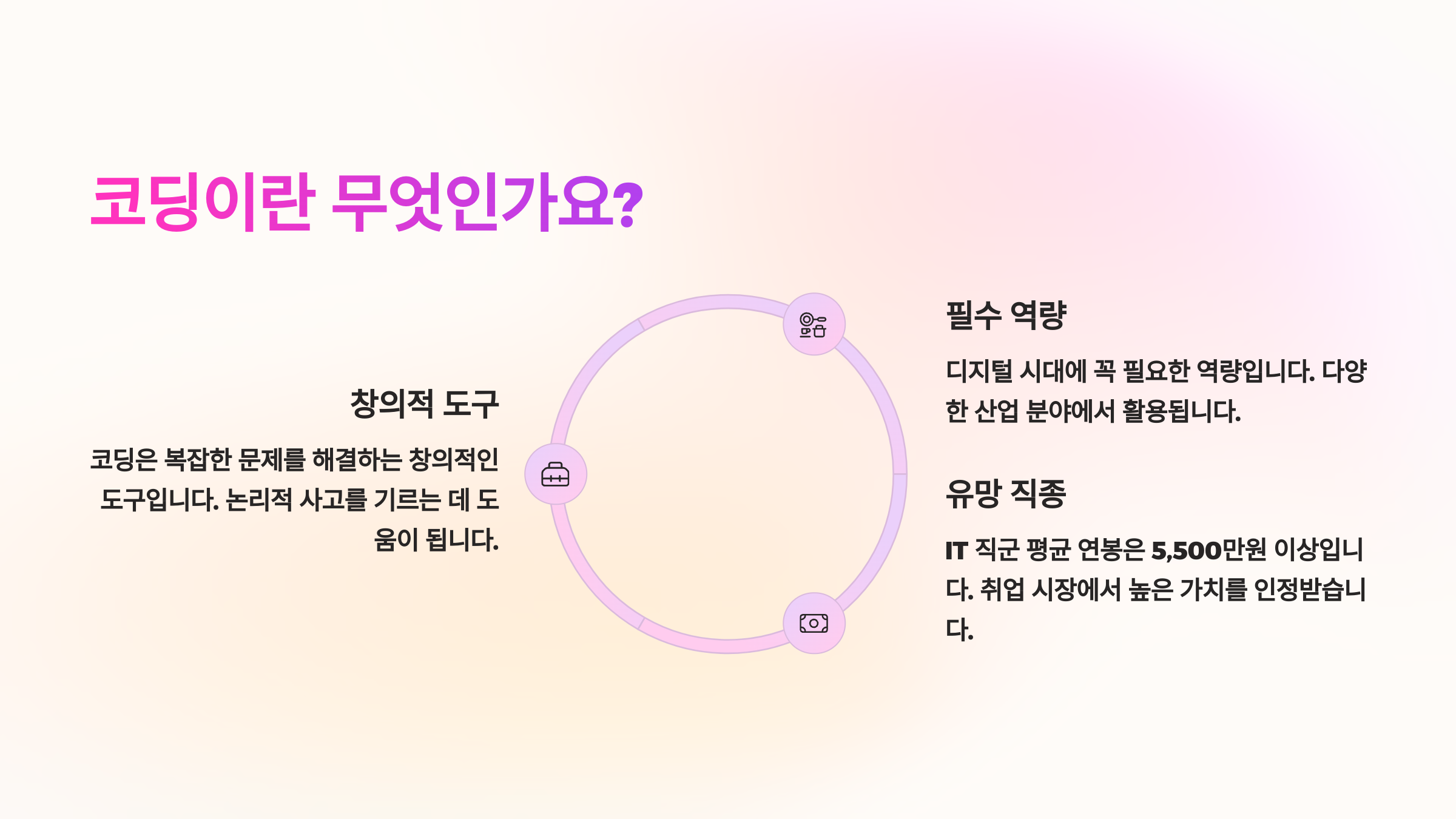 💡 그럼 코딩이 왜 중요할까요? 요즘 세상은 거의 모든 산업이 디지털 기술과 연결돼 있어요. 코딩은 단순한 ‘기술’이 아니라, 문제 해결 능력과 논리적 사고력을 키우는 도구이기도 해요!