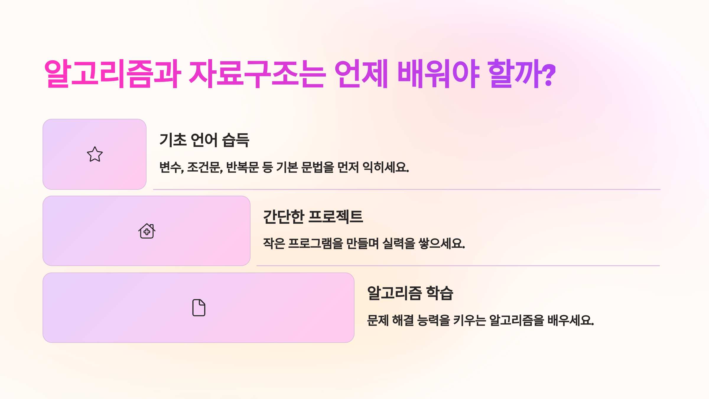 🔍 "알고리즘부터 시작해야 하나요?"라는 질문을 많이 받아요. 결론부터 말하면 처음엔 꼭 필요하진 않아요. 코딩 자체에 익숙해지고, 프로젝트를 몇 개 해본 후 배우는 게 훨씬 효과적이에요!